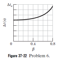 Reference frame S’ is to pass reference frame S at speed v along the common direction of the and x axes, as in Fig. 37-9. An observer who rides along with frame S’ is to count off a certain time interval on his wristwatch. The corresponding time interval is to be measured by an observer in frame S. Figure 37-22 gives versus speed parameter for a range of values for . The vertical axis scale is set by ta 14.0 s. What is interval if v = 0.98c?