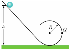 Question: In Figure, a solid brass ball of mass 0.280 g will roll smoothly along a loop-the-loop track when released from rest along the straight section. The circular loop has radiusr=14.o cm and the ball has radius r<<R(a) What is hif the ball is on the verge of leaving the track when it reaches the top of the loop? If the ball is released at height, h = 6.00R (b) What is the magnitude of the horizontal force component acting on the ball at point Q? (c) What is the direction of the horizontal force component acting on the ball at point Q?