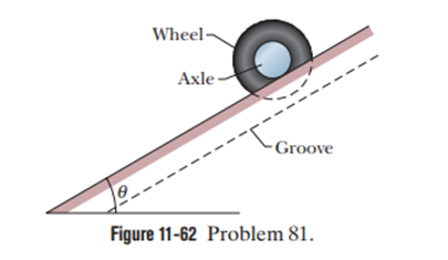 A uniform wheel of mass 10.0 kgand radius 0.400 mis mounted rigidly on a mass less axle through its center (Fig. 11-62). The radius of the axle is 0.200 m, and the rotational inertia of the wheel–axle combination about its central axis is0.600 kg.m2. The wheel is initially at rest at the top of a surface that is inclined at angle. with the horizontal; the axle rests on the surface while the wheel extends into a groove in the surface without touching the surface. Once released, the axle rolls down along the surface smoothly and without slipping. When the wheel–axle combination has moved down the surface by 2.00 m, what are (a) its rotational kinetic energy and (b) its translational kinetic energy?