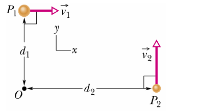 In the instant of Figure, two particles move in an xy plane. Particle P1has mass 6.5kgand speed v1 = 202m/s, and it is at distance d1 = 105mfrom point O. Particle P2has mass 3.1kgand speed v2 = 3.6m/sand it is at distance d2 = 2.8mfrom point O. (a) What is the magnitude of the net angular momentum of the two particles about O? (b) What is the direction of the net angular momentum of the two particles about O?