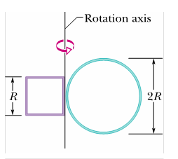Figure shows a rigid structure consisting of a circular hoop of radius and mass, and a square made of four thin bars, each of lengthand mass. The rigid structure rotates at a constant speed about a vertical axis, with a period of rotation of. Assumingandrole="math" localid="1660971946053" ,