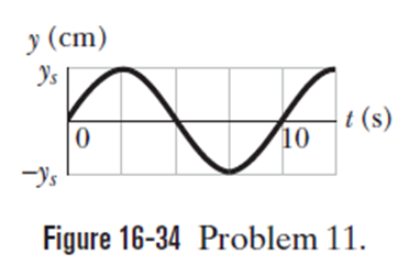A sinusoidal transverse wave of wavelength 20cmtravels along a string in the positive direction of anaxis. The displacement y of the string particle at x=0is given in Figure 16-34 as a function of time t. The scale of the vertical axis is set byThe wave equation is to be in the form. (a) At t=0, is a plot of y versus x in the shape of a positive sine function or a negative sine function? (b) What is, (c) What isk,(d) What is, (e) What is (f) What is the sign in front of, and (g) What is the speed of the wave? (h) What is the transverse velocity of the particle at x=0when t=5.0 s?