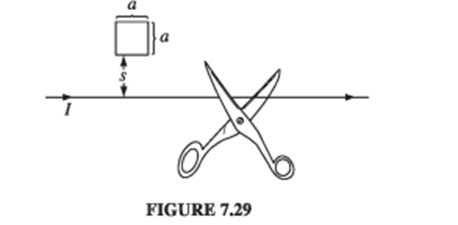 A square loop, side a , resistance R , lies a distance from an infinite straight wire that carries current l (Fig. 7.29). Now someone cuts the wire, so l drops to zero. In what direction does the induced current in the square loop flow, and what total charge passes a given point in the loop during the time this current flows? If you don't like the scissors model, turn the current down gradually: