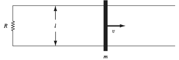 A metal bar of mass m slides frictionlessly on two parallel conducting rails a distance l apart (Fig. 7 .17). A resistor R is connected across the rails, and a uniform magnetic field B, pointing into the page, fills the entire region.