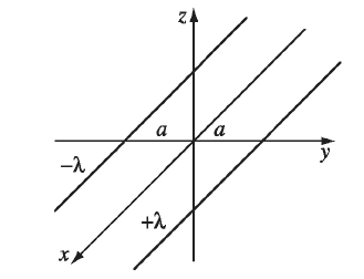 Two infinitely long wires running parallel to the x axis carry uniform