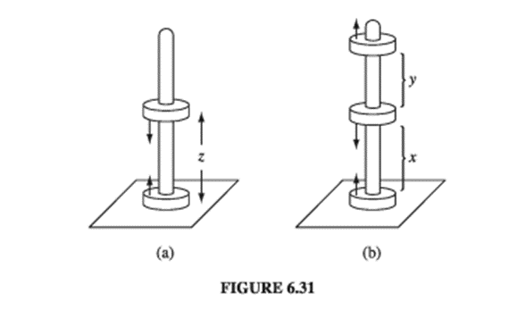 A familiar toy consists of donut-shaped permanent magnets (magnetization parallel to the axis), which slide frictionlessly on a vertical rod (Fig. 6.31). Treat the magnets as dipoles, with mass md and dipole moment m.