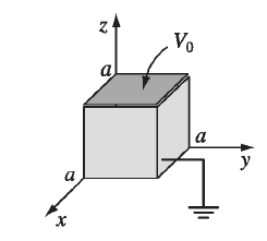A cubical box (sides of length a) consists of five metal plates, which are welded together and grounded (Fig. 3.23). The top is made of a separate sheet of metal, insulated from the others, and held at a constant potential. Find the potential inside the box. [What should the potential at the center be ? Check numerically that your formula is consistent with this value.]