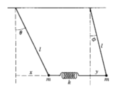 For small vibrations, find the characteristic frequencies and the characteristic modes of vibration of the coupled pendulums shown. All motion takes place in a single vertical plane. Assume the spring is unstretched when both pendulums hang vertically and take the spring constant asto simplify the algebra. Hints: Write the kinetic and potential energies in terms of the rectangular coordinates of the masses relative to their positions hanging at rest. Don’t forget the gravitational potential energies. Then write the rectangular coordinates and in terms of and , and for small vibrations approximate , and similar equations for .