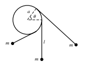 Find the Lagrangian and the Lagrange equation for the pendulum shown. The vertical circle is fixed. The string winds up or unwinds as the massswings back and forth. Assume that the unwound part of the string at any time is in a straight-line tangent to the circle. Letbe the length of the unwound string when the pendulum hangs straight down.