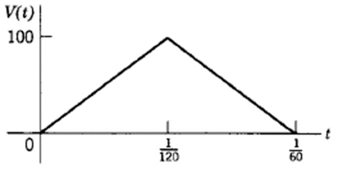 6. Triangular wave; the graph consists of two straight lines whose equations you must write! The maximum voltage of occurs at the middle of the cycle.