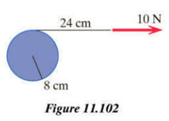 In Figure 11.102, the uniform solid disk has mass (moment of inertia). At the instant shown, the angular velocity is 20 rad/sinto the page. (a) At this instant, what are the magnitude and direction of the angular momentum about the center of the disk? (b) At a timelater, what are the magnitude and direction of the angular momentum about the center of the disk? (c) At this later time, what are the magnitude and direction of the angular velocity?