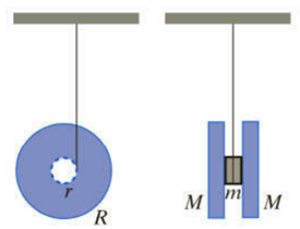 A yo-yo is constructed of three disks: two outer disks of mass , radius , and thickness , and an inner disk (around which the string is wrapped) of mass , radius , and thickness . The yo-yo is suspended from the ceiling and then released with the string vertical (figure).