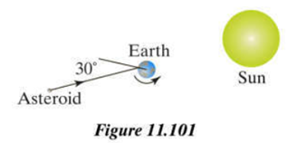 Suppose that an asteroid of massis nearly at rest outside the solar system, far beyond Pluto. It falls toward the Sun andcrashes into the Earth at theequator, coming in at angle ofto the vertical as shown, against the direction of rotation of the Earth (Figure 11.101; not to scale). It is so large that its motion is barely affected by the atmosphere.