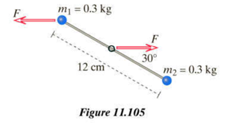 A barbell is mounted on a nearly frictionless axle through its center (Figure 11.105). At this instant, there are two forces of equal magnitude applied to the system as shown, with the directions indicated, and at this instant, the angular velocity is 60 Rad/s, counterclockwise. In the next ,the angular momentum relative to the center increases by an amount 2.5 kg.meter square per second. What is the magnitude of each force? What is the net force?