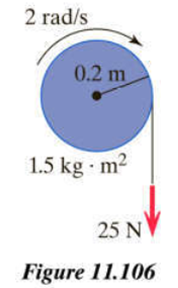 A disk of radius and moment of inertia is mounted on a nearly frictionless axle (Figure 11.106). A string is wrapped tightly around the disk, and you pull on the string with a constant force of . After a while the disk has reached an angular speed ofWhat is its angular speed seconds later? Explain briefly.