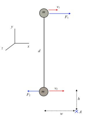 In figure two small objects each of mass are connected by a lightweight rod of length At a particular instant they have velocities whose magnitude are and and are subjected to external forces whose magnitudes are and. The distance role="math" localid="1668661918159" and the distanceThe system is moving in outer space. Assuming the usual coordinate system withto the right, toward the top of the page, and out of the page toward you, calculated these quantities for this system: