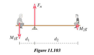 Two people of different masses sit on a seesaw (Figure 11.103). the mass of personisisandThe people are initially at rest. The mass of the board is negligible.