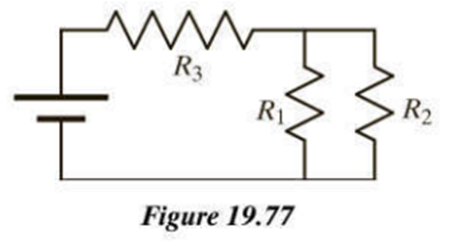 In the circuit shown in Figure 19.77 the emf of the battery is . Resistor has a resistance of , resistor has a resistance of , and resistor has a resistance of . A steady current flows through the circuit.
