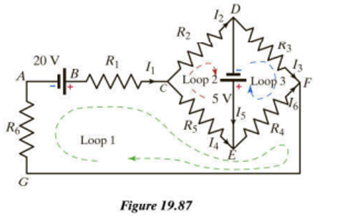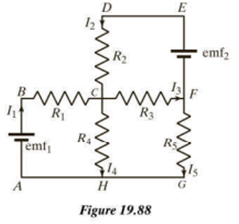 A circuit consists of two batteries (with negligible internal resistance), five ohmic resistors (Figure 19.88). The connecting wires that have negligible resistance. The letters A through are shown to make it possible to refer to specific parts of the circuit.