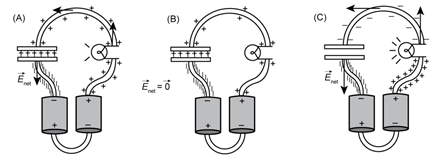 When a particular capacitor, which is initially uncharged, is connected to a battery and a small light bulb, the light bulb is initially bright but gradually gets dimmer, and after it goes out. The diagrams in Figure 19.71 show the electric field in the circuit and the surface charge distribution on the wires at three different times ( , , and ) after the connection to the bulb is made. Which of the diagrams best represents the state of the circuit at each time specified?