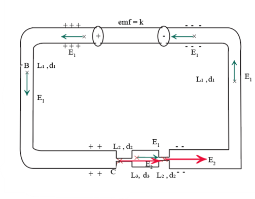 (a) The direction of the electric field is anticlockwise in the circuit, and the field is smaller in the thick wire than the field in the thin wire.