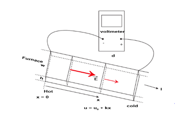 A long Iron slab of width w and height h emerges from a furnace, as shown in Figure 19.79. Because the end of the slab near the furnace is hot and the other end Is cold, the electron mobility increases significantly with the distance x. The electron mobility iswhere u0is the mobility of the iron at the hot end of the slab. There are n iron atoms per cubic meter, and each atom contributes one electron to the sea of the mobile electron (we can neglect the small thermal expansion of the iron). A steady state conventional current runs through the slab from the hot end towards cold end, and an ammeter (not shown) measures the current to have a magnitude I in amperes. A voltmeter is connected to two locations a distance d apart, as shown. (a) Show the electric field inside the slab at two locations marked with. Pay attention to the relative magnitudes of the two vectors that you draw. (b) Explain why the magnitude of the electric field is different at these two locations. (c) At a distance x from the left voltmeter connection, what is the magnitude of the electric field in terms x and the given quantities w, h, d, u0, k, l, and n ( and fundamental constants)? (d) What is the sign of potential difference displayed on the voltmeter? Explain briefly. (e) In terms of the given quantitiesw, h, d, u0, k, l, and n and ( and fundamental constants), what is the magnitude of the voltmeter reading? Check your work. (f) What is the resistance of this length of the iron slab?