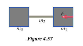 Two blocks of mass m1 and m3 , connected by a rod of mass m2 , are sitting on a low friction surface, and you push to the left on the right block (mass m1 ) with a constant force of magnitude F(Figure 4.57).