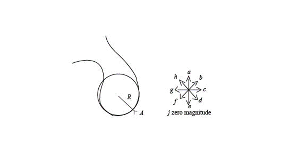 A proton moving in a magnetic field follows the curving path shown in Figure. The dashed circle is the kissing circle tangent to the path when the proton is at location A. The proton is traveling at a constant speed of 7.0 x 105 m/s, and the radius of the kissing circle is 0.08m . The mass of a proton is 1.7 x 10-27kg . Refer to the directional arrows shown at the right in Figure when answering the questions below.
