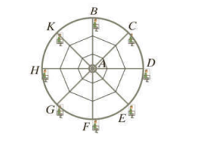 There is no general analytical solution for the motion of a three-body gravitational system. However, there do exist analytical solutions for very special initial conditions. Figure shows three stars, each of mass m. which move in the plane of the page along a circle of radius r. Calculate how long this system takes to make one complete revolution. (In many cases three-body orbits are not stable: any slight perturbation leads to a breakup of the orbit.)