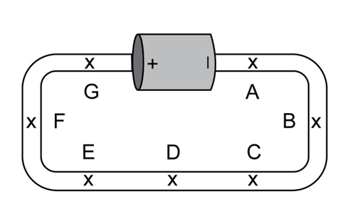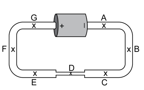 In the circuit shown in Figure 18.91, all of the wire is made of Nichrome, but one segment has a much smaller cross-sectional area. On a copy of this diagram, using the same scale for magnitude that you used in the previous question for Figure 18.90, show the steady-state electric field at the locations indicated, including in the thinner segment. Before attempting to answer these questions, draw a copy of this diagram. All of the locations indicated by letters are inside the wire.