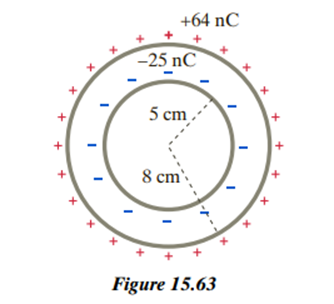 A thin plastic spherical shell of radius 5 cmhas a uniformly distributed charge of -25nCon its outer surface. A concentric thin plastic spherical shell of radius 8 cmhas a uniformly distributed charge of+64nC on its outer surface. Find the magnitude and direction of the electric field at distances of, 3 cm, 7 cm and 10 cmfrom the center. See Figure 15.63.