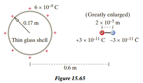 Question: A thin hollow spherical glass shell of radius carries a uniformly distributed positive charge , as shown in Figure 15.65. To the right of it is a horizontal permanent dipole with charges and separated by a distance (the dipole is shown greatly enlarged for clarity). The dipole is fixed in position and is not free to rotate. The distance from the center of the glass shell to the center of the dipole is 0.6 m.