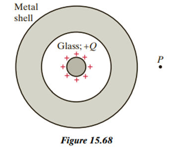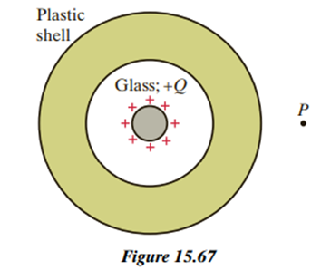 (a) Qualitatively, indicate the polarization of the plastic. (b) Qualitatively, indicate the polarization of the inner glass sphere. Explain briefly. (c) Is the electric field at location P outside the plastic shell larger, smaller, or the same as it would be if the plastic weren’t there? Explain briefly. (d) Now suppose that the glass sphere carrying a uniform charge of is surrounded by an initially neutral metal shell (Figure 15.68). Qualitatively, indicate the polarization of the metal.
