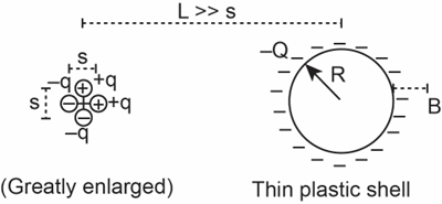 : A thin, hollow spherical plastic shell of radius \({\bf{R}}\)carries a uniformly distributed negative charge \({\bf{ - Q}}\). A slice through the plastic shell is shown in Figure 14.95. To the left of the spherical shell are four charges packed closely together as shown (the distance \({\bf{s}}\) is shown greatly enlarged for clarity). The distance from the center of the four charges to the center of the plastic shell is \({\bf{L}}\) , which is much larger than \({\bf{s}}\left( {{\bf{L}} \gg {\bf{s}}} \right)\). Remember that a uniformly charged sphere makes an electric field as though all the charge were concentrated at the center of the sphere.