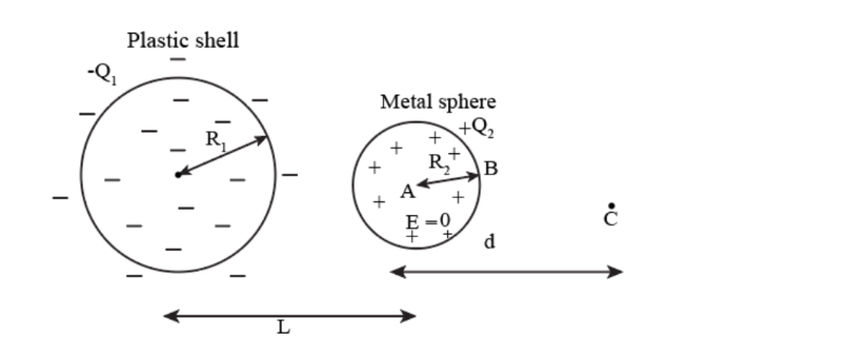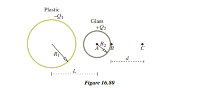 A thin spherical shell of radius \({R_1}\)made of plastic carries a uniformly distributed negative charge \( - {Q_1}\). A thin spherical shell of radius \({R_2}\)made of glass carries a uniformly distributed positive charge \( + {Q_2}\). The distance between centers is \(L\), as shown in Figure 16.80. (a) Find the potential difference \({V_B} - {V_A}\). Location A is at the center of the glass sphere, and location \(B\) is just outside the glass sphere. (b) Find the potential difference \({V_C} - {V_B}\). Location \(B\) is just outside the glass sphere, and location \(C\) is a distance d to the right of \(B\). (c) Suppose the glass shell is replaced by a solid metal sphere with radius R2 carrying charge \( + {Q_2}\). Would the magnitude of the potential difference \({V_B} - {V_A}\) be greater than, less than, or the same as it was with the glass shell in place? Explain briefly, including an appropriate physics diagram.