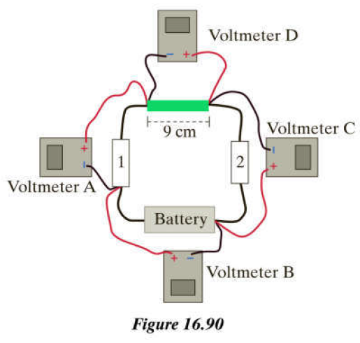 Four voltmeters are connected to a circuit as shown in figure 16.90. As is usual with voltmeters, the reading on the voltmeter is positive if the negative lead (black wire, usually labled COM) is connected to a location at lower potential, and the positive lead(red) is connected to a location at higher potential. The circuit contains two devices whose identity is unknown and a rod (green) of length 9 cm made of conducting material. At a particular moment, the reading observed in the voltmeters are, voltmeter A: -1.6 V, voltmeter B: -6 V, voltmeter A: -3.5 V. (a) At this moment, what is the reading on voltmeter D, both magnitude and sign? (b) What are the magnitude and direction of the electric field inside the rod?