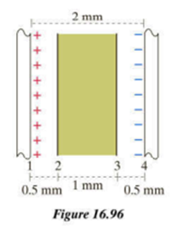 An isolated large plate capacitor (not connected to anything) originally has a potential difference of 1000 V with an air gap of 2 mm. Then a plastic slab 1 mm thick, with dielectric constant 5, is inserted in the middle of the air gap as shown in figure 16.96. Calculate the following potential differences and explain your work.