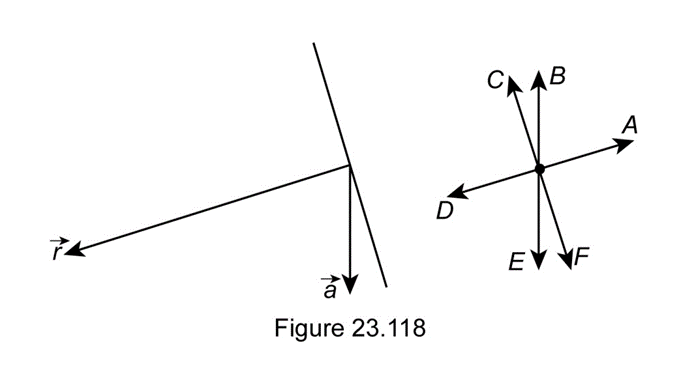 A proton is accelerated in the direction shown by the arrow labeled \(\vec a\) in Figure 23.118. Which of the arrows labeled A–F correctly shows the direction of the vector \({\vec a_ \bot }\)at the observation location indicated by the vector \(\vec r\)?