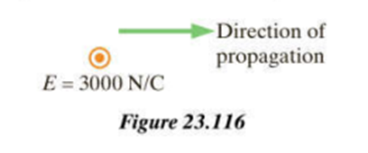 In Figure 23.116 electromagnetic radiation is moving to the right, and at this time and place the electric field is horizontal and points out of the page. The magnitude of the electric field is E=3000 N/C. What are the magnitude and direction of the associated magnetic field at this time and place?