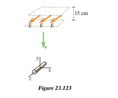 A slab (pulse) of electromagnetic radiation that is 15cm thick is propagating downward (in the direction) toward a short horizontal copper wire located at the origin and oriented parallel to the z axis, as shown in Figure 23.123. (a) The direction of the electric field inside the slab is out of the page (in the direction). On a diagram, show and describe clearly the direction of the magnetic field inside the slab.