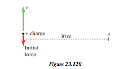 You stand at location A , to the right of the charge (Figure 23.120), with instruments for measuring electric and magnetic fields. What will you observe due to the motion of the positive charge, at what times? You do not need to calculate the magnitudes of the electric and magnetic fields, but you do need to specify their directions, and the times when these fields are observed.