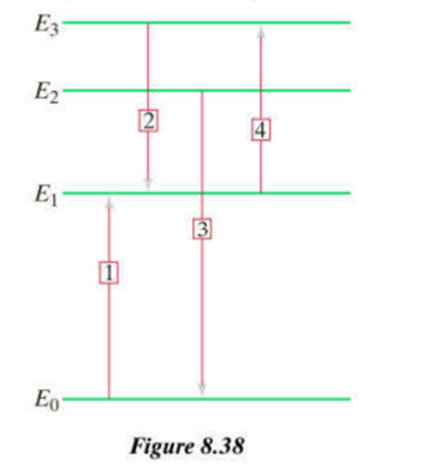 Match the description of a process with the corresponding arrow in figure 8.38: (a) Absorption of a photon whose energy is . (b) Absorption from an excited state (a rare event at ordinary temperatures). (c) Emission of a photon whose energy is . (d) Emission of a photon whose energy is . (e) In drawing arrows to represent energy transitions, which of the following statement are correct. (1) it doesn鈥檛 matter in which direction you draw the arrow as long as it connects the initial and final states. (2) For emission, the arrow points down. (3) For absorption, the arrow points up. (4) The tail of the arrow is drawn on the initial state. (5) The head of the arrow is drawn on the final state. (6) It is not necessary to draw and arrowhead.