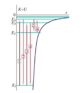 Next, the electron beam is turned off, and all the atoms are in the ground state. Light containing a continuous spectrum of photon energies from to shines through the bottle. A photon detector on the other side of the bottle shows that some photon energies are depleted in the spectrum (鈥渄ark lines鈥). What are the energies of the missing photons?