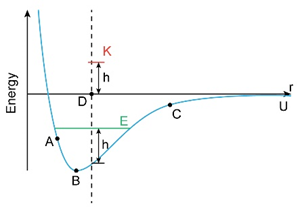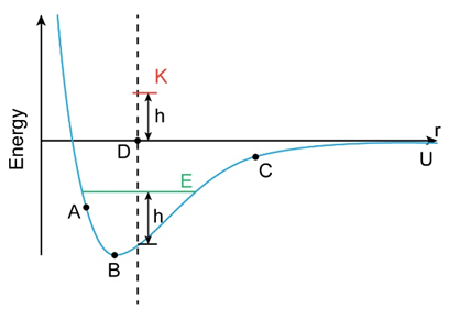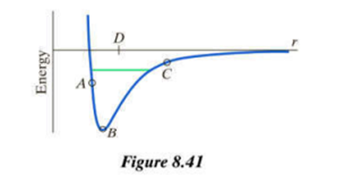 Energy graphs: (a) Figure 8.41 shows a graph of potential energy vs. interatomic distance for a particular molecule. What is the direction of the associated force at location A? At location B? At location C? Rank the magnitude of the force at locations A,B and C. (That is, which is greatest , which is smallest, and are any of these equal to each other?) For the energy level shown on the graph, draw a line whose height is the kinetic energy when the system is at location D.
