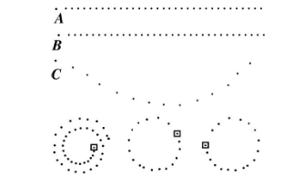Question: Moving objects left the traces labeled A-F in Figure 1.54. The dots were deposited at equal time intervals (for example, one dot each second). In each case the object starts from the square. Which trajectories show evidence that the moving object was interacting with another object somewhere? If there is evidence of an interaction, what is the evidence?