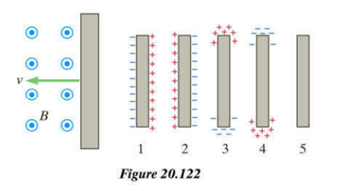 A neutral iron bar is dragged to the left at speed v through a region with a magnetic field B points out of the page (Figure 20.122). Which diagram (1-5) best shows the state of the bar?
