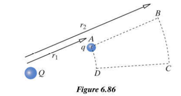 Refer to figure 6.86. Calculate the change in electric energy along the two different paths in moving charge away from charge from A to B along a radial path, then to C along a circle centeredon , then to D along a radial path. Also calculate the change in energy in going directly from A to D along a circle centered at . Specifically. What are and their sum? What is ? Also, calculate the round-trip difference in the electrical energy when moving charge along the path from A to B to C to D to A.