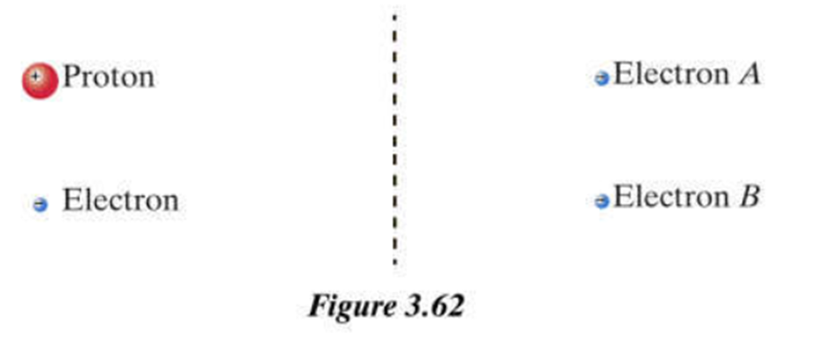 The left side of Figure 3.62 shows a proton and an electron. (a) What is the direction of the electric force on the electron by the proton? (b) What is the direction of the electric force on the proton by the electron? (c) How do the magnitudes of these forces compare? The right side of the figure shows two electrons. (d) What is the direction of electric forces on electron A due to electron B? (d) What is the direction of electric forces on electron B due to electron A? (d) How do the magnitudes of these forces compare.
