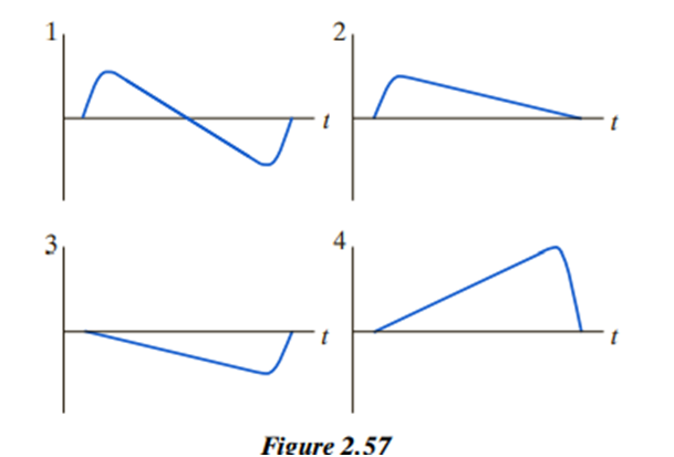 (c) Fan backward: The fan is turned on facing the 鈥渨rong鈥 way, and you hold the cart stationary. You give it a brief push, and the cart moves forward, in the +x direction, slowing down and then turning around, returning to the starting position, where you quickly stop and hold the cart. Figure 2.57 displays four graphs of px (numbered 1鈥4), the x component of momentum, vs. time. The graphs start when the cart is at rest, and end when the cart is again at rest. Match the experiment with the correct graph.