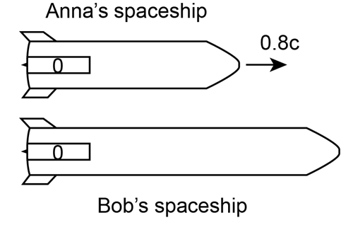 Anna and Bob are In identical spaceships, each 100 m long. The diagram shows Bob's, view as Anna's ship passes at 0.8c. Just as the backs of the ships pass one another, both clocks.there read O. At the instant shown, Bob Jr., on board Bob's ship, is aligned with the very front of Anna's ship. He peers through a window in Anna's ship and looks at the clock. (a) In relation to his own ship, where is Bob Jr? (b) What does the clock he sees read?